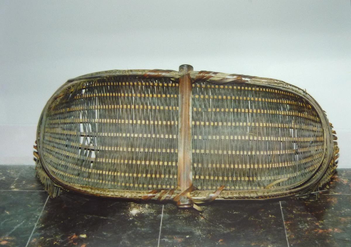 細く割ったひごを用いた目の詰むんだゴザ目編み(笊編み)の器。川魚の採補に使っていた。