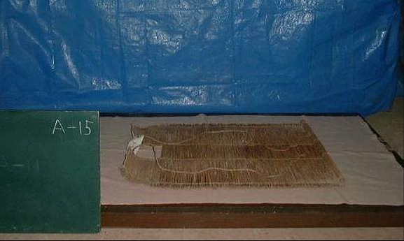 背蓑:背中を覆う小型の蓑で、幅が狭く細長い形が多い。主として日照り除けや荷背負いの為に用いるもの。