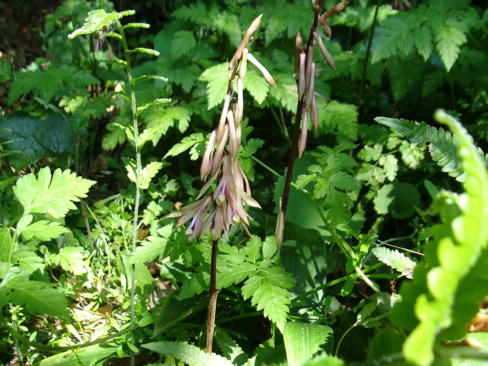 山の木かげに生える多年草。花の茎は高さ30~50cmで10~20個の花をびっしり垂らす。花は淡緑褐色で紅紫色を帯びることが多く、*花弁は細長くあまり開かない。垂れた穂を武将の指揮棒である采配(さいはい)に見立てて、名がつけられた。野坂や許斐山、金山などにわずかにある。花期5~6月。